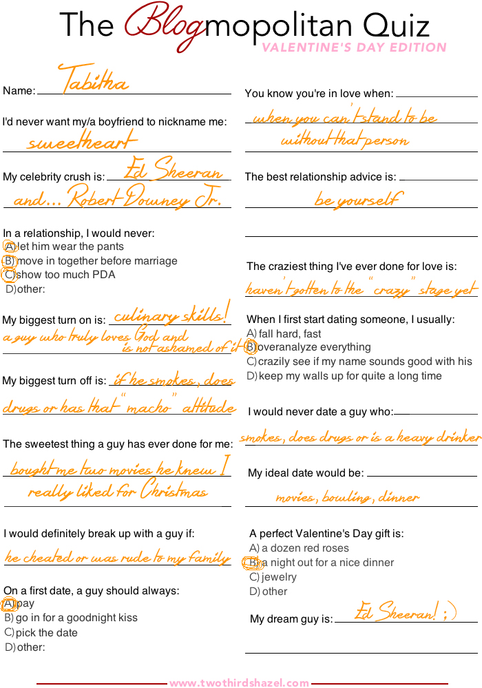 As I was logging on my computer to write what would be my infamous anti-Valentine’s Day post, I came across a post from Val of In-Between Life entitled Valentine’s Day Quiz and curiosity got the best of me.  It turns out another blogger, Erin at Two Thirds Hazel, created an editable quiz for other bloggers to download, fill out and link-up on their own blogs for the special day.  So, rather than be a pessimist about Valentine’s Day, I decided to fill out the quiz since well, I love doing quizzes (that are non-academic related).
