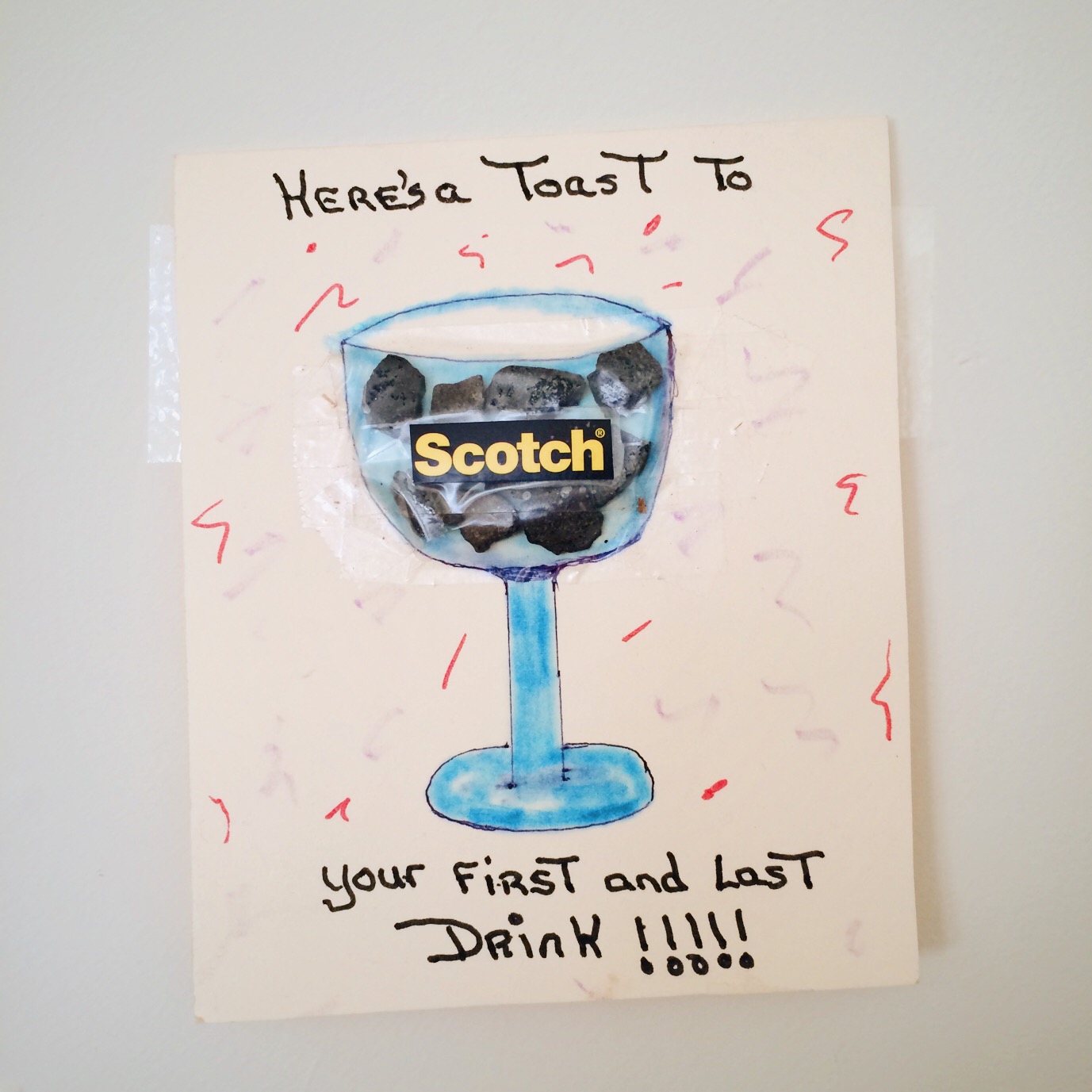 My dad actually picked up rocks from his driveway and used Scotch tape to stick them to the card as my first and last “drink” … how creative is that?  I love it and it’s on display in my room on the wall rather than just sitting in a box full of mementos because of the thought and work that was put into it.  Of course, my other card is up on my wall as well, but I’m just using this one as an example – and because it was the first homemade card I ever got.
