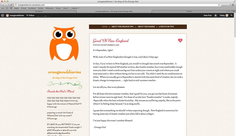 If you look hard enough you can also see that I didn’t use my real name in the beginning. I simply went by Orange Owl. I made the change of signing my name when I started to connect my blog to Twitter and Facebook… since the people there would see my name anyway.