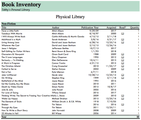 Yes, I took an inventory of the books I own, including ebooks, and put them into a lovely document to keep track of them all.